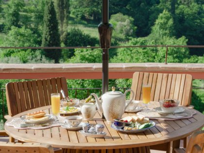 Im Sommer wird das Frühstück auf den beiden Panoramaterrassen im Grünen serviert – mit herrlichem Blick auf die umliegenden Hügel.