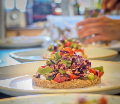 Zum Angebot gehören: Gemüse der Saison, Suppen, Polenta-Lasagne, Risotto mit Mandelbutter, Brot, Pasta und Gnocchi, hausgemachte Pfannkuchen mit Gemüse und Gewürzen, Kräutern, Ölsamen, frisches Gemüse und leckere Soßen. Und als Nachtisch Torten mit Mandeln oder Haselnüssen, lockere Kuchen mit Obst der Saison, Schokolade Salami, gekochte Sahne mit Pflanzenmilch …