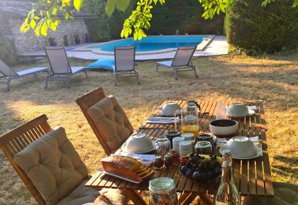 You will enjoy a large breakfast outside by the pool and in the shade of the chestnut trees during summer or in the veranda. For breakfast we propose fresh bread (or tasty home made gluten free bread), cake, or french brioche or pastries of the day, home made yogurt (normal or vegan), fruits, orange juice, coffee or tee, eggs, cheese (or vegan cheese), homemade jam. You may also have a gluten, free or vegan breakfast just let us know when you book your room.