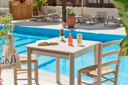Of course, GOJI’s vegan restaurant/snack bar by the pool is at the core of our facilities. Our guests can enjoy their breakfast with handmade marmalades, a selection of bread, freshly brewed coffee or tea from local herbs with almond, oat, or soya milk and freshly cut fruits. For lunch, guests can try a local vegan dish every day, such as “gigantes” (giant beans) with vegan feta cheese and tomato sauce or our famous rhodian “pitaroudia” (chickpea balls with herbs). Guests can also choose their drinks from our vegan wine or cocktail list, like the GOJI Mojito.