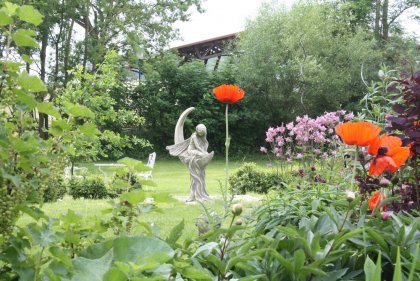 Our “elemental garden” and the “wild garden” invite you to dream and relax with their many cozy corners. In winter, you can read comfortably by the fireplace, be pampered with massages or just chat with us and the other guests. For even more relaxation, we have a whirlpool for 6 people in the garden.