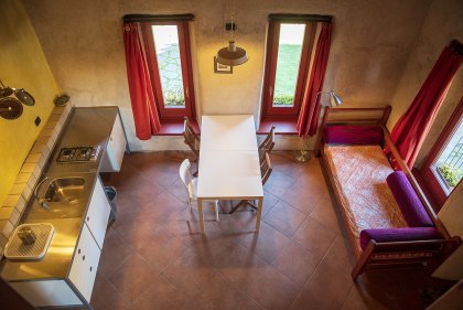 Chestnut wood, cocciopesto from Piasco, solar heating, vegetal insulation, rainwater collection and vegetable based detergents all help us to lighten our impact on the surrounding environment.