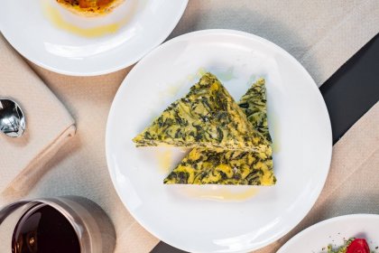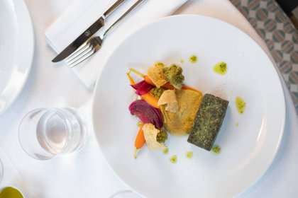 Das hauseigene Restaurant serviert ein vollständig veganes Menü mit einem zeitgemäßen kulinarischen Ansatz, der sich auf Saisonprodukte, hausgemachte Zubereitungen (Fermentationen, frische Pasta, Tofu, Tempeh) und raffiniertes Gebäck konzentriert.