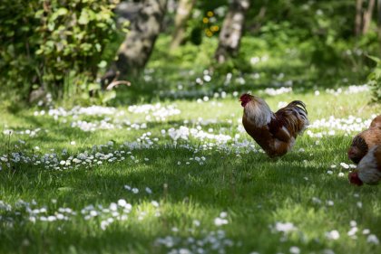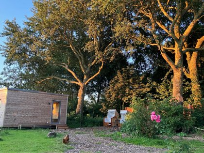 The house features a large garden with old fruit trees and lawns for sunbathing, plenty of beach chairs for relaxing, a sunny terrace right in front of the house, and an enchanting pond ecosystem. We have chickens, cats, a gentle dog, as well as two ponies and a horse who are enjoying their retirement here. For relaxation, our guests can enjoy a sauna with a sweeping view across the paddocks.